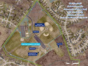 A one-acre dog park. The park has fenced areas for small and large dogs as well as benches for their owners. The dog park area is located on the back (southeastern) side of the park accessible from the “Sports Complex” parking lot and the walking path. To visit, drive to the end of the “Sports Complex” parking lot, or you can access the dog park by utilizing the walking trail.